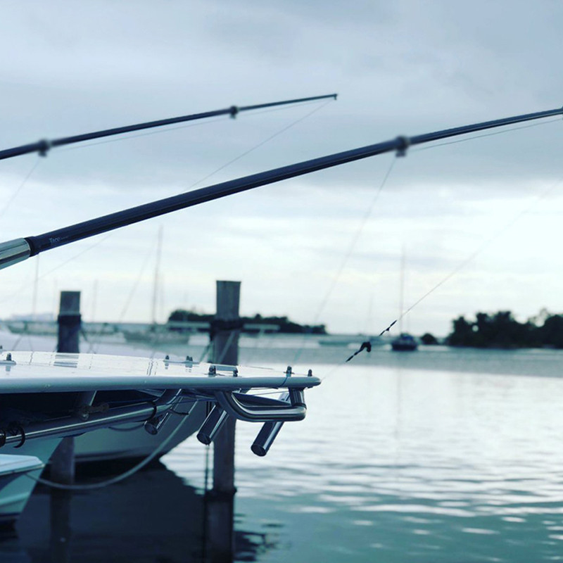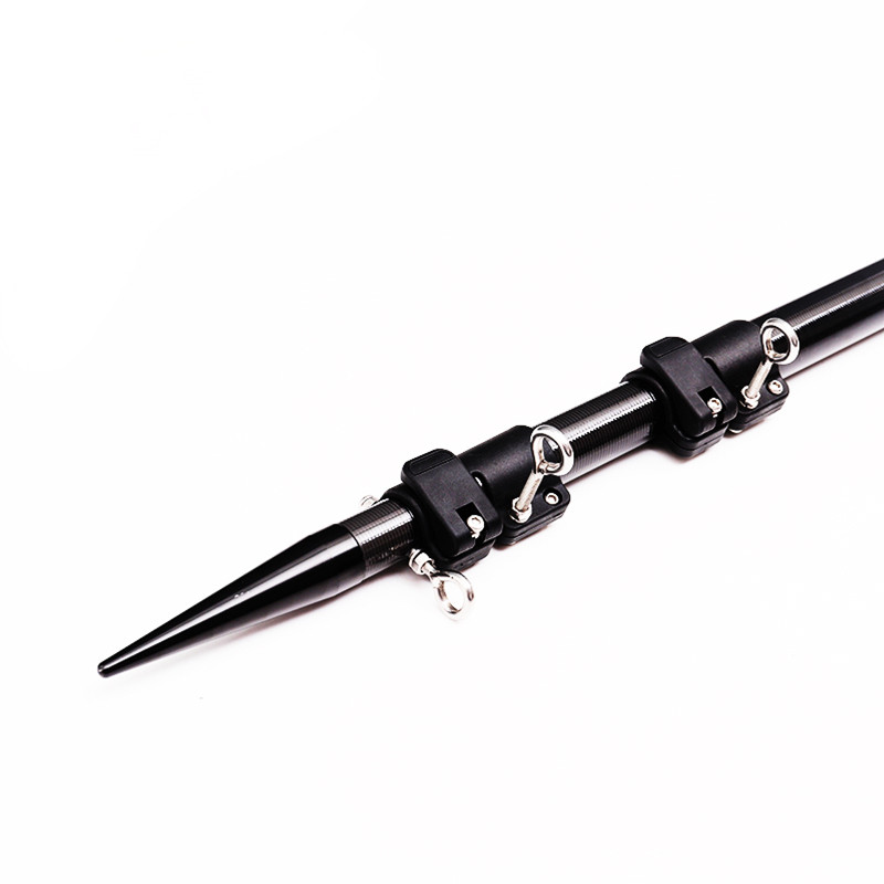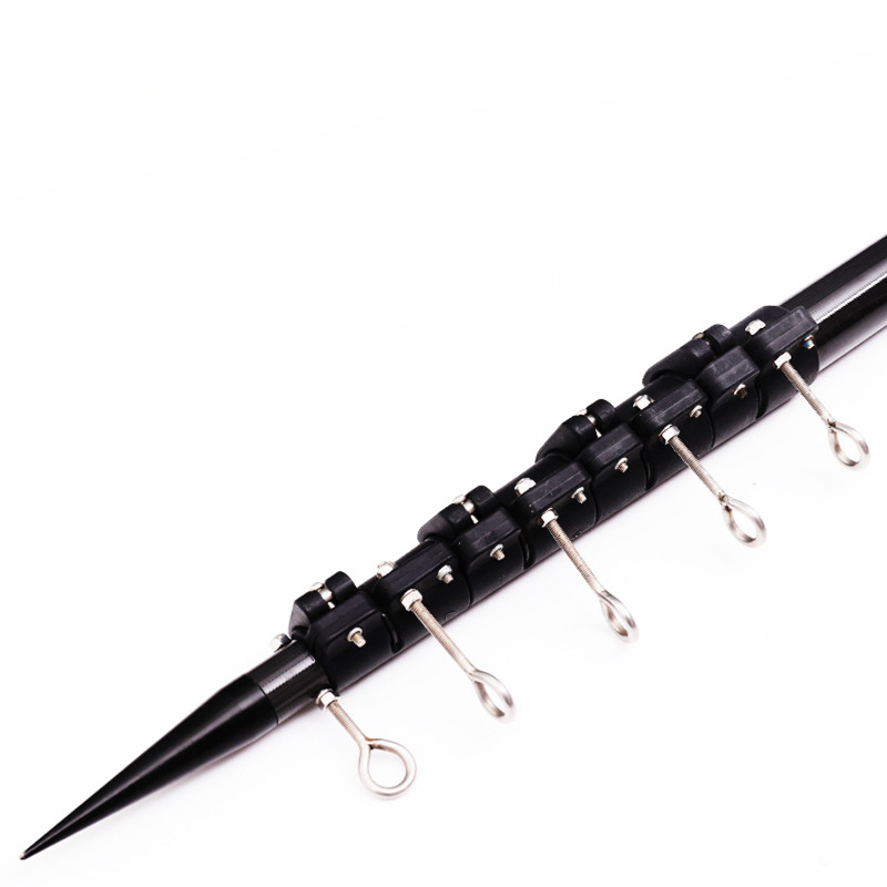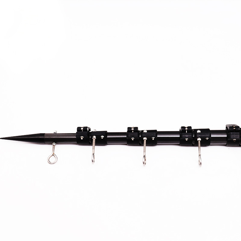 | Advantage | 1. 100% Carbon Fiber pole construction 2. UV-resistant clearcoat 3. Stainless Steel Type 316 rings 4. Clamp design allows for a more natural swimming action which results in hooking more fish 5. The extension length is 24ft and the contraction length is 1.8m 6. Telescopes to less than 8' for bridge clearance, trailering and storage 7. Locking collar design keeps poles from extending when trailering or running full speed and also keeps poles from collapsing when fully extended |