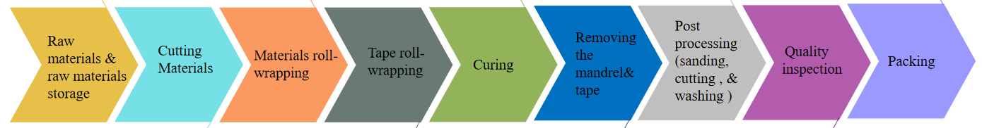 Производственный процесс ① Хранение сырья ③ рулонные упаковочные машины ⑤ Печи для отверждения ⑦ Шлифмашины из Тайваня. ② режущие машины ④ машины для обмотки рулонной ленты ⑥Снятие оправки и ленты ⑧Проверка качества ⑨ Упаковка Как изготавливаются рулонные трубки из углеродного волокна